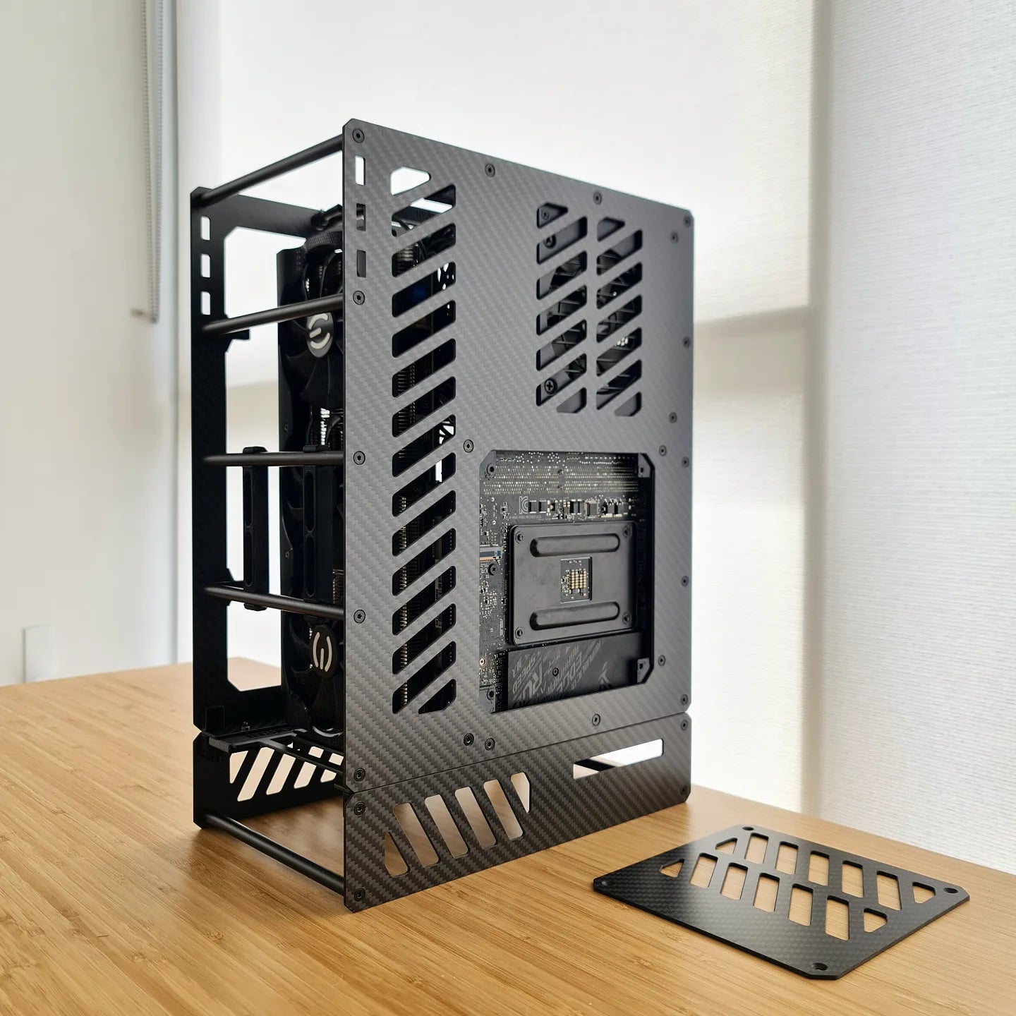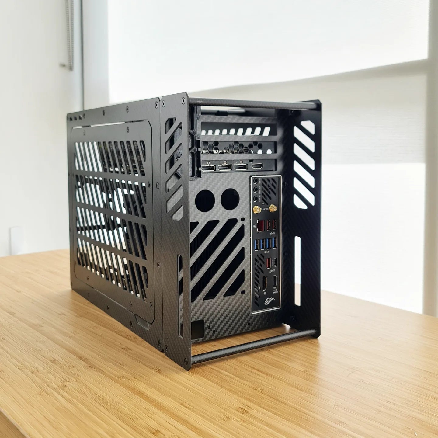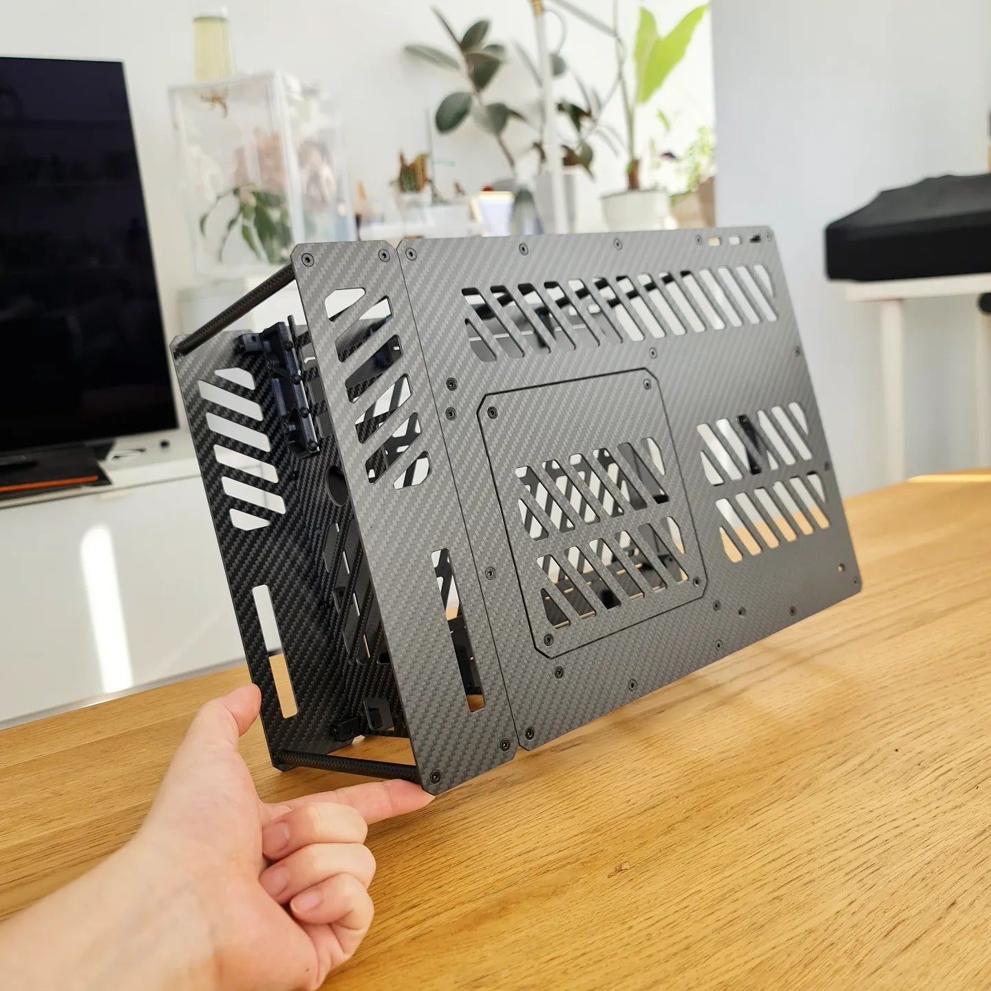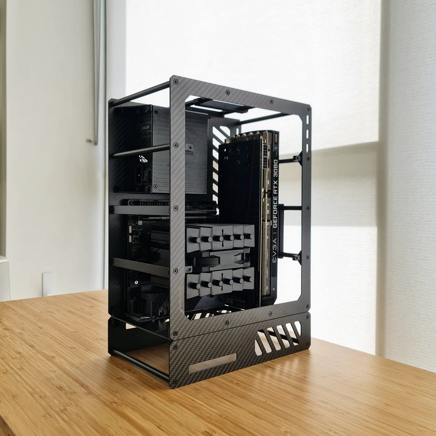 HYDRA is a stunning semi-open carbon fiber PC case like no other. Made possible through a combination of CNC carbon fiber and 3D printing, the HYDRA combines the openness afforded by carbon's strength, while special mounting features are handled by 3D printed parts.