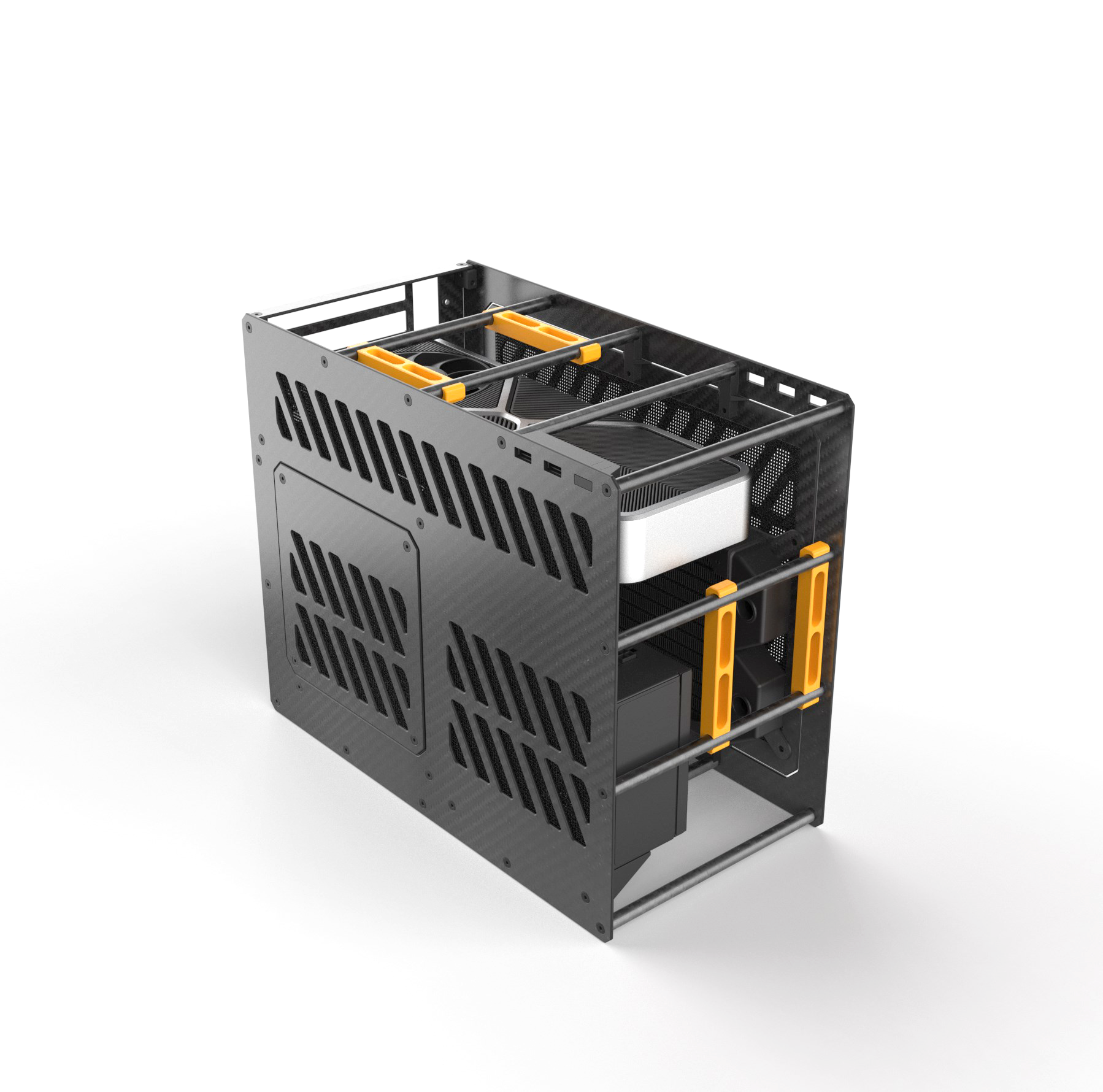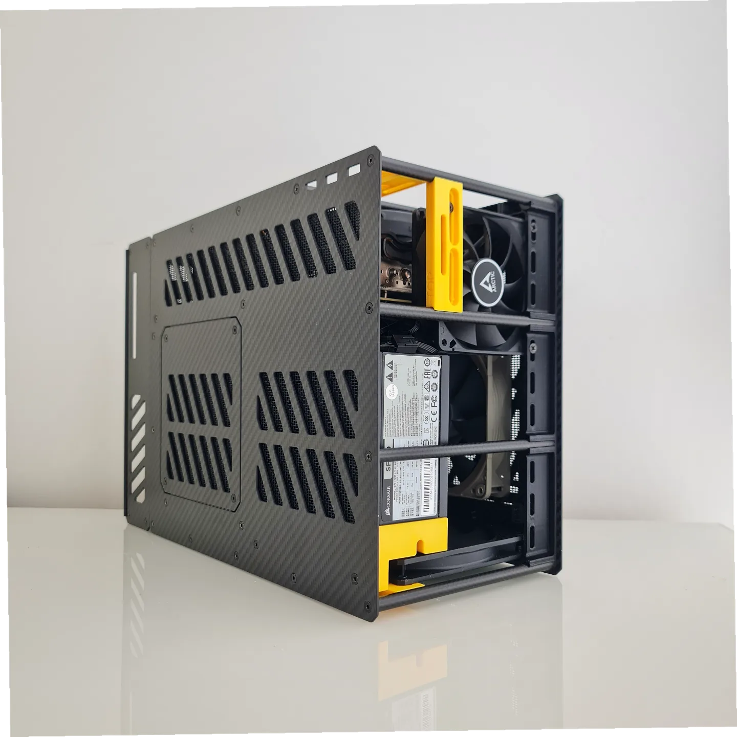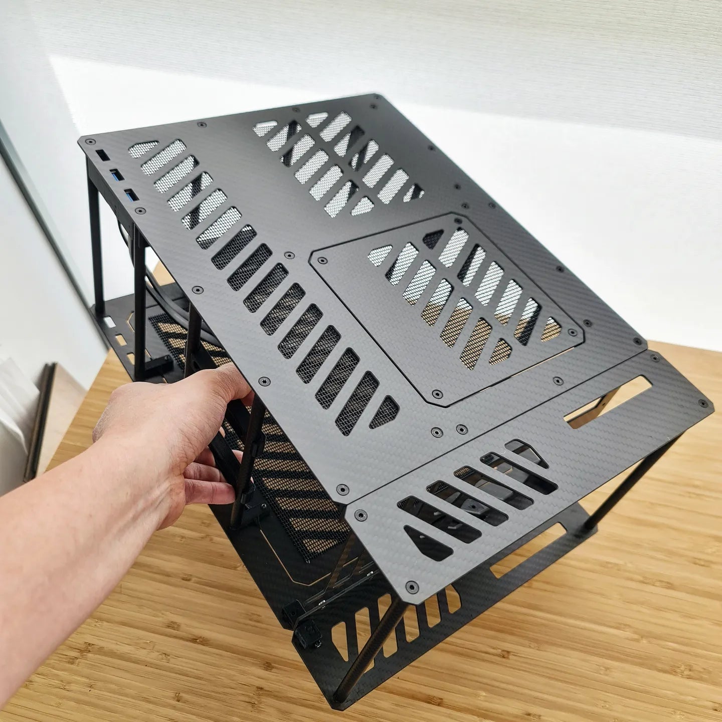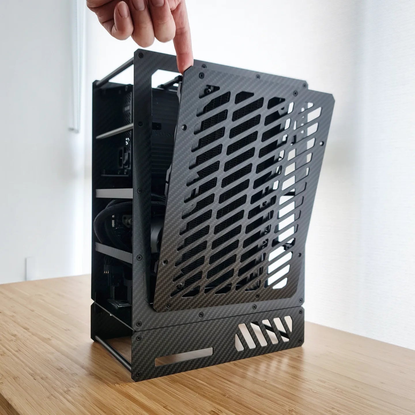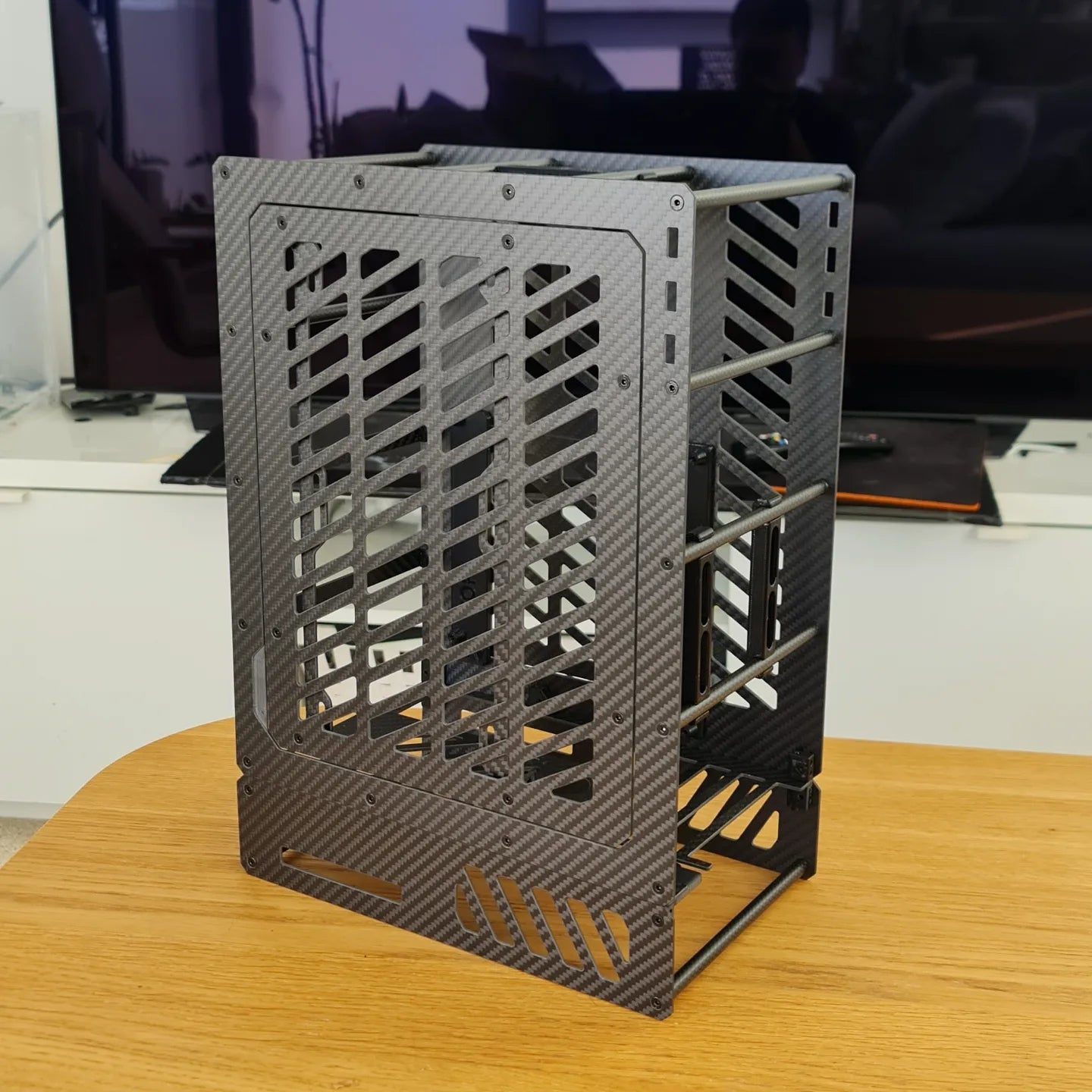 HYDRA is a stunning semi-open carbon fiber PC case like no other. Made possible through a combination of CNC carbon fiber and 3D printing, the HYDRA combines the openness afforded by carbon's strength, while special mounting features are handled by 3D printed parts.